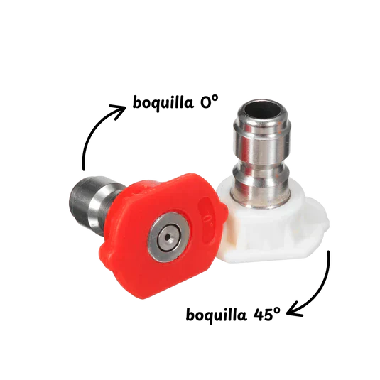 Las boquillas de 0º y 45º te permiten adaptar la limpieza: la de 0º es perfecta para suciedad difícil y la de 45º ideal para superficies amplias y enjuagues rápidos.